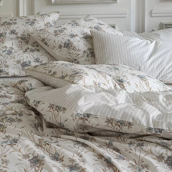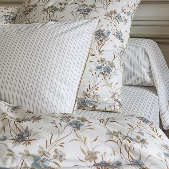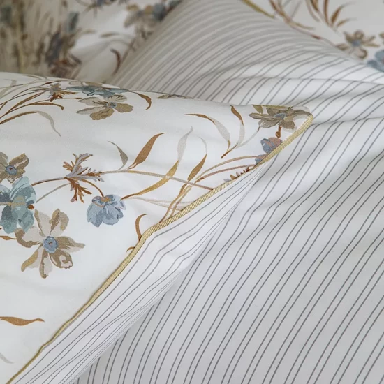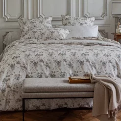 Calm and soothing hues of tan, grege and blue trace anemone flowers upon a white ground of crisp percale for the Joli Jour bedding collection by Anne de Solene. Using two fabric prints specifically newly designed by LIBERTY for Anne de Anne de Solene, Joli Jour combines a fresh artistically drawn floral print with a contemporary stripe. Together the look is sophisticated, relaxed and beautiful. Printed percale construction. The LIBERTY prints used to make Joli Jour are exclusive to Anne de Anne de Solene.