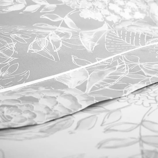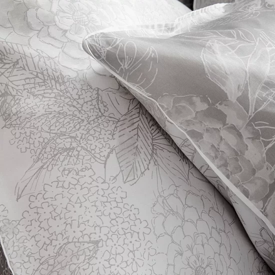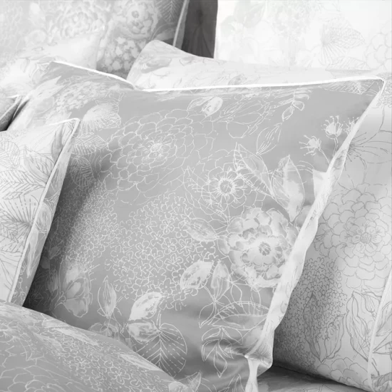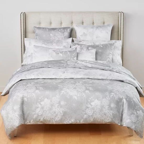 A lustrous gray background hosts pale floral bouquets for this eternally elegant Muse bedding collection from Anne de Solene.